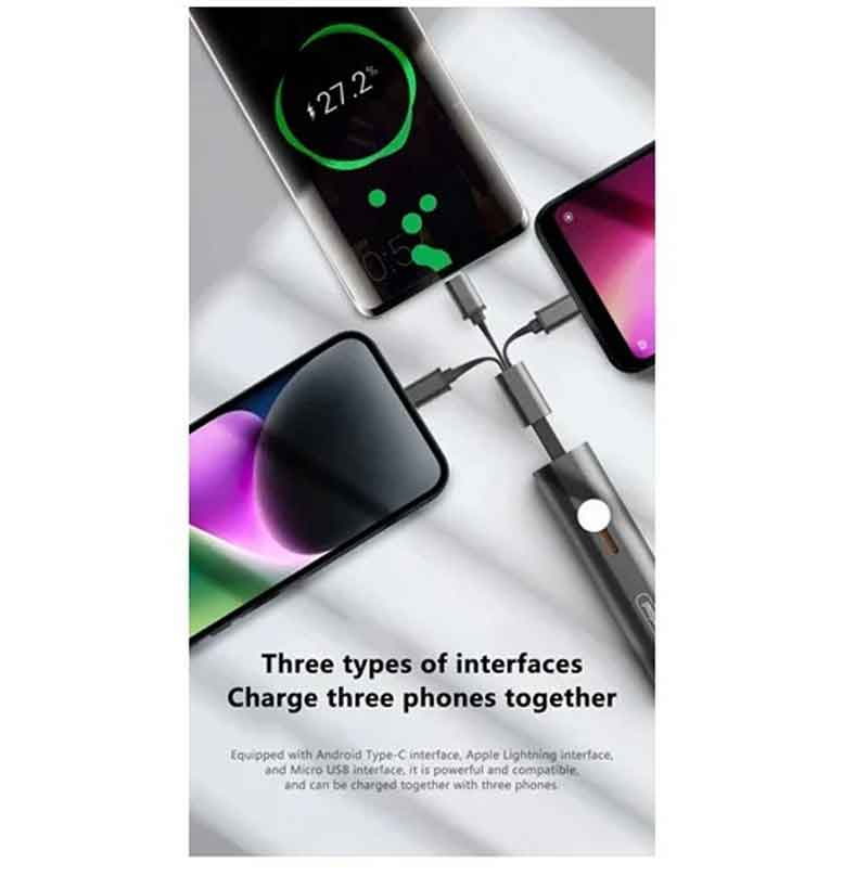 Περιλαμβάνει ενσωματωμένα καλώδια Micro USB, iOS (Lightning) και Type-C, επιτρέποντας τη σύνδεση και φόρτιση πολλαπλών συσκευών με ένα μόνο καλώδιο.