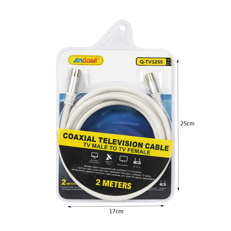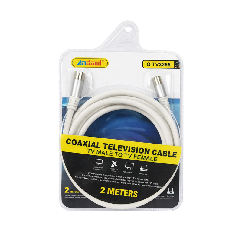 Ομοαξονικό καλώδιο τηλεόρασης μήκους 2 μέτρων, με σύνδεση TV αρσενικό σε TV θηλυκό, ιδανικό για επέκταση ή σύνδεση κεραίας με τηλεόραση ή αποκωδικοποιητή. Κατάλληλο για οικιακή χρήση και συμβατό με τις περισσότερες συσκευές που διαθέτουν υποδοχή τηλεοπτικού σήματος.
