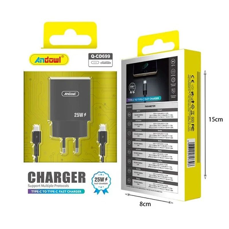 Ο φορτιστής Andowl Q-CD699 προσφέρει ταχύτατη φόρτιση 25W μέσω θύρας Type-C σε Type-C, ιδανική για σύγχρονες συσκευές Android και άλλες συμβατές συσκευές. Υποστηρίζει πολλαπλά πρωτόκολλα γρήγορης φόρτισης, εξασφαλίζοντας ασφαλή και σταθερή απόδοση χωρίς υπερθέρμανση. Διαθέτει κομψό και ανθεκτικό σχεδιασμό, ιδανικό για καθημερινή χρήση στο σπίτι, στο γραφείο ή στα ταξίδια. Περιλαμβάνει καλώδιο Type-C σε Type-C στη συσκευασία.