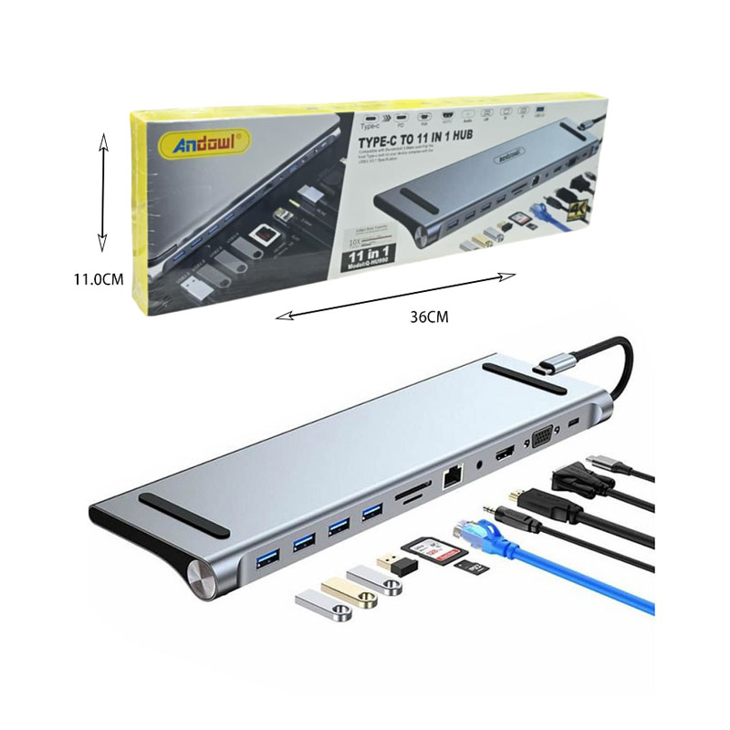 Docking Station της εταιρίας Andowl που συνδέεται σε Laptop με θύρα USB-C.