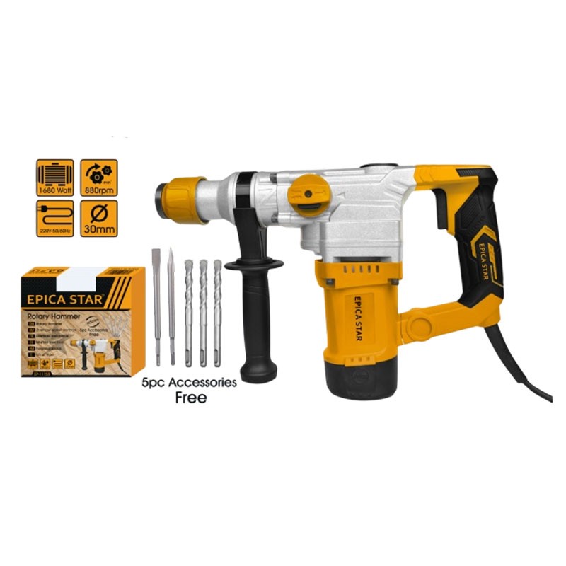 Περιλαμβάνει 5 αξεσουάρ (μυτερό καλέμι, πλατύ καλέμι, τρυπάνια)