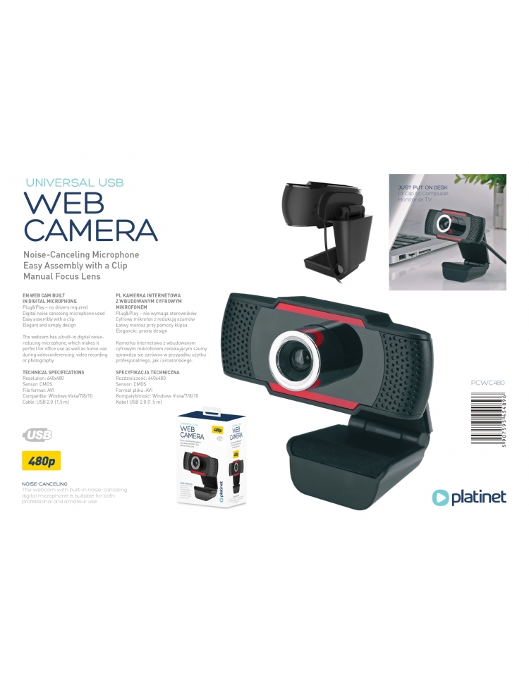 PLATINET WEB CAM 480P ΚΑΤΑΣΚΕΥΗ ΣΕ ΨΗΦΙΑΚΟ Μικρόφωνο Web Cam 480P ενσωματωμένο ψηφιακό μικρόφωνο ΒΑΣΙΚΑ ΧΑΡΑΚΤΗΡΙΣΤΙΚΑ Plug & Play – δεν απαιτούνται προγράμματα οδήγησης Χρησιμοποιήθηκε ψηφιακό μικρόφωνο ακύρωσης θορύβου Εύκολη συναρμολόγηση με κλιπ Κομψό και απλό σχεδιασμό Η κάμερα Platinet 480p διαθέτει ενσωματωμένο ψηφιακό μικρόφωνο μείωσης θορύβου, το οποίο το καθιστά ιδανικό για χρήση στο γραφείο καθώς και για οικιακή χρήση κατά τη διάρκεια τηλεδιάσκεψης, εγγραφής βίντεο ή φωτογραφίας. Η συσκευή δεν απαιτεί εγκατάσταση χρησιμοποιώντας προγράμματα οδήγησης χάρη στη λειτουργία plug & play. Η κάμερα web προσφέρει υψηλή ποιότητα ήχου και ευκρίνεια εικόνας σε συνδυασμό με την κομψή σχεδίαση της συσκευής. ΤΕΧΝΙΚΕΣ ΠΡΟΔΙΑΓΡΑΦΕΣ Ανάλυση: 640×480 Αισθητήρας: CMOS Μορφή αρχείου: AVI Συμβατό: Windows Vista / 7/8/10 Καλώδιο: USB 2.0 (1,5 m)