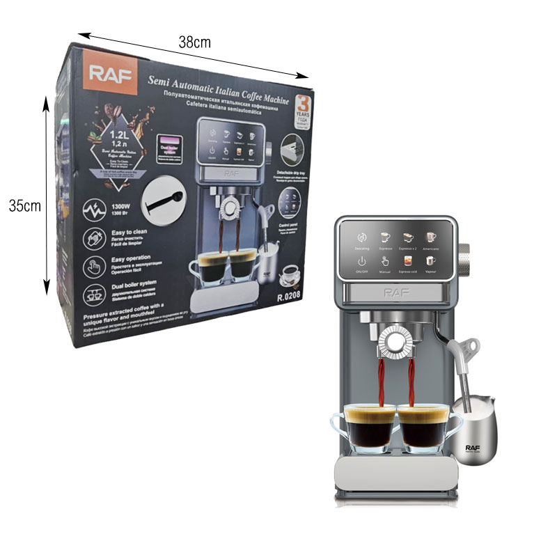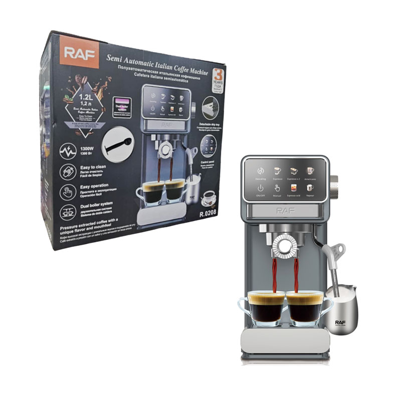 Η ημιαυτόματη ιταλική καφετιέρα RAF R-0208 συνδυάζει κομψό σχεδιασμό και υψηλή απόδοση για να απολαμβάνετε αυθεντικό espresso στο σπίτι σας. Με ισχύ 1300W και σύστημα διπλού λέβητα, προσφέρει σταθερή θερμοκρασία και εξαιρετική ποιότητα ροφήματος σε ελάχιστο χρόνο. Διαθέτει δοχείο νερού 1.2 λίτρων με ένδειξη στάθμης, σωλήνα ατμού για αφρόγαλα, εύχρηστο πίνακα ελέγχου και λειτουργίες ασφαλείας για ξέγνοιαστη χρήση. Ιδανική για τους λάτρεις του καφέ που θέλουν επαγγελματικό αποτέλεσμα στην κουζίνα τους.
