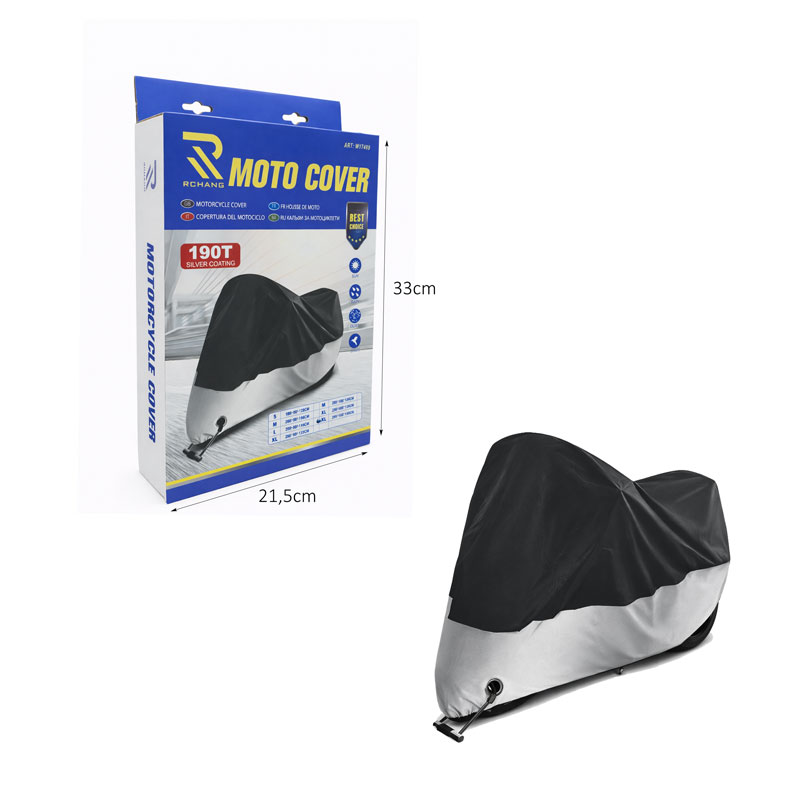 Ανθεκτική κουκούλα κάλυμμα μοτοσυκλέτας, σχεδιασμένη για αξιόπιστη προστασία από καιρικές συνθήκες και εξωτερικούς παράγοντες. Κατασκευασμένη από ύφασμα 190T με ειδική ασημί επίστρωση, προσφέρει προστασία από βροχή, σκόνη, ήλιο και υγρασία, συμβάλλοντας στη διατήρηση της μοτοσυκλέτας σε άριστη κατάσταση. Εφαρμόζει εύκολα και σταθερά, ενώ διαθέτει άνοιγμα στο κάτω μέρος για καλύτερη συγκράτηση και ασφάλεια. Ιδανική για καθημερινή χρήση σε εξωτερικούς χώρους, πάρκινγκ ή αποθήκευση.
