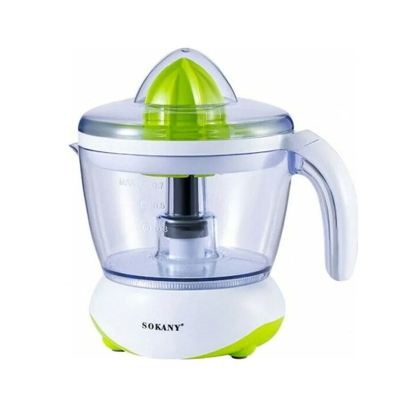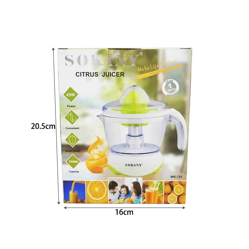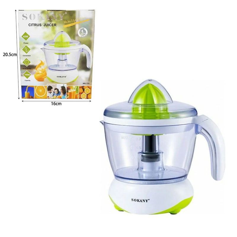 Ηλεκτρικός στίφτης WK-725, της εταιρείας Sokany, με ισχύ 45 Watt. Διαθέτει έναν κώνο κανονικού μεγέθους κατάλληλο για πορτοκάλια, ώστε να απολαμβάνετε καθημερινά φρέσκους χυμούς, πλούσιους σε βιταμίνες. Το φίλτρο που συμπεριλαμβάνεται θα ξεχωρίσει τον χυμό από τον πολτό και τα κουκούτσια, δίνοντας σας το βέλτιστο αποτέλεσμα και την καλύτερη γεύση. Το δοχείο συλλογής χυμού έχει χωρητικότητα 700 ml με διαβαθμισμένη κλίμακα, ώστε να είστε πάντα ενήμεροι για την ποσότητα χυμού που έχετε παράξει.